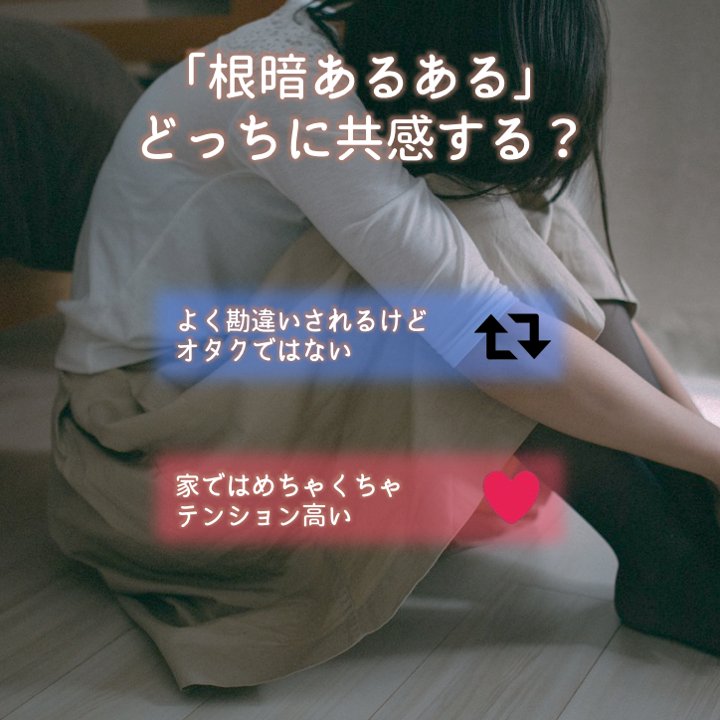 O Xrhsths My Place マイプレイス Sto Twitter どっちに共感する 根暗あるある どっちに共感する よく勘違いされるけどオタクではない Rt 家ではめちゃくちゃテンション高い あなたや友達はどっちに当てはまる 性格 診断 占い 友達